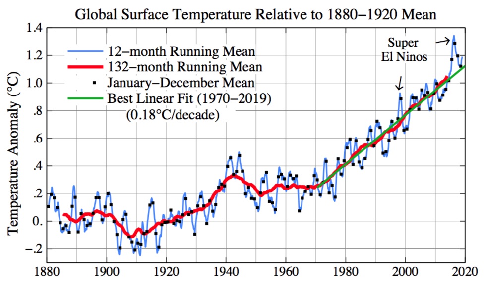 Remember the hiatus in warming that climate deniers claimed was happening during the noughties? That was always a crude lie, because they started their graphs at 1998 when a super-el-niño pushed the temperature up, as it does. If they had started their graphs in 1996 or 1999 they would have had to say there is rapid warming. But that would be wrong too. What counts is the trend averaged over 5-10 years, which irons out most of the wiggles. You can see that the warming was actually continuing through the noughties, perhaps at a slightly slower rate.